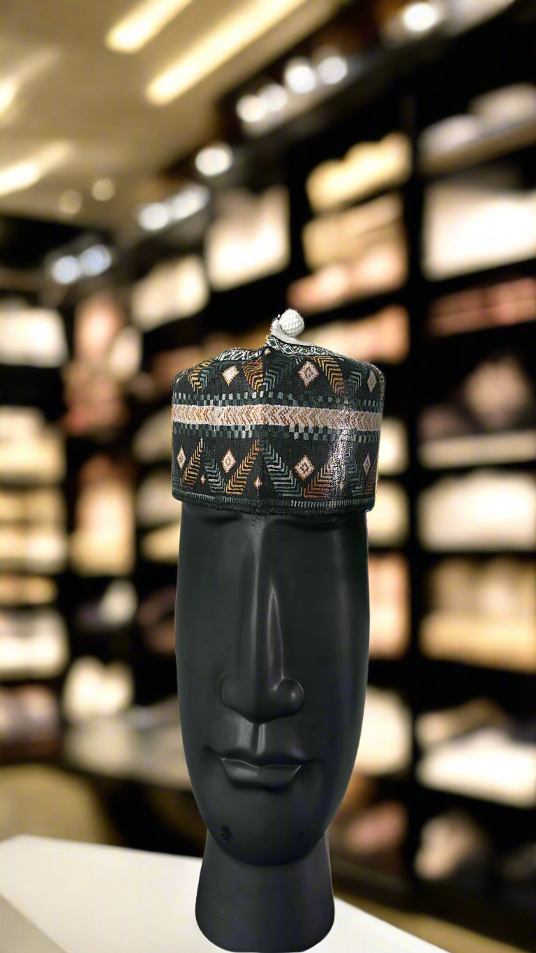The Getzner Hat in Forest & Gold Chevron blends cultural depth with contemporary design. Crafted from the Getzner fabric, it features a forest green backdrop accented with golden chevron stripes and earthy geometric patterns. This statement accessory embodies pride, heritage, and a bold sense of style, ideal for occasions where tradition meets individuality.